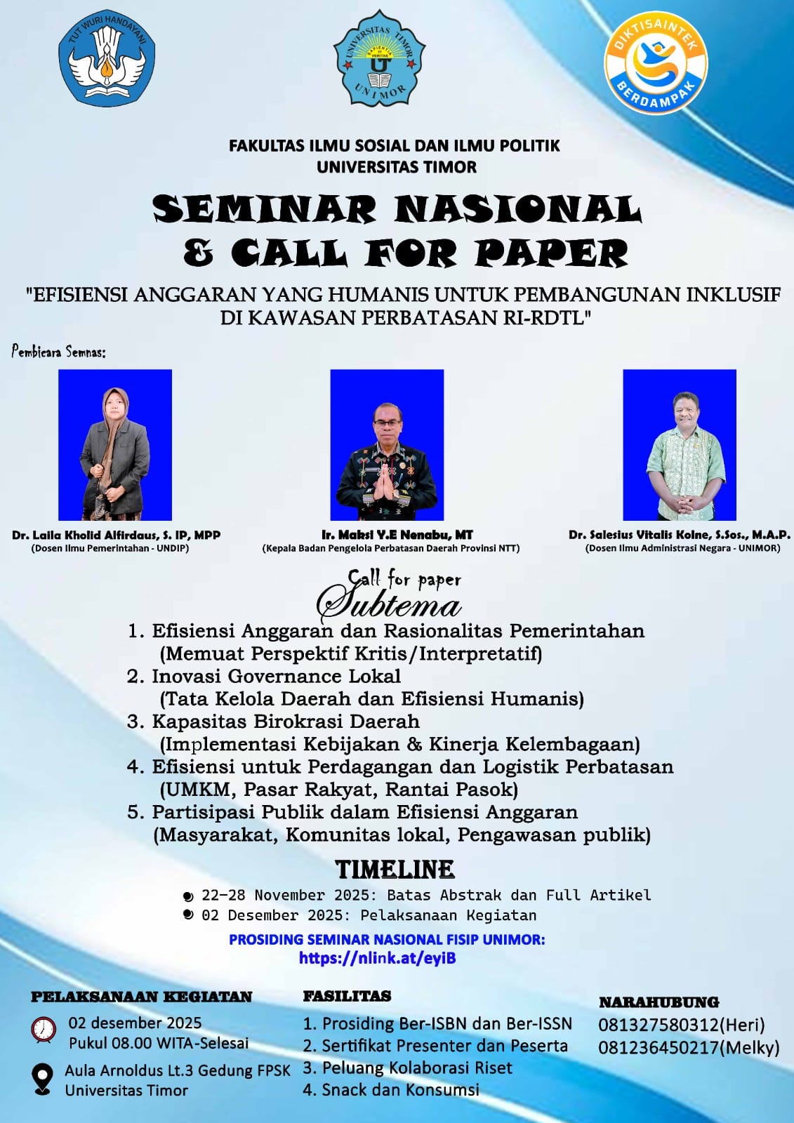 Kefamenanu – Fakultas Ilmu Sosial dan Ilmu Politik (FISIP) Universitas Timor akan menggelar Seminar Nasional dan Call for Paper 2025 bertema “Efisiensi Anggaran yang Humanis untuk Pembangunan Inklusif di Kawasan Perbatasan RI–RDTL.” Seminar rencananya digelar pada 2...