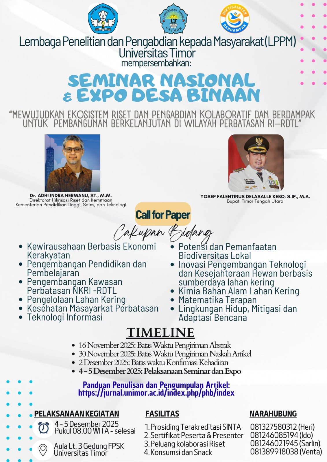 Lembaga Penelitian dan Pengabdian kepada Masyarakat (LPPM) Universitas Timor dengan hormat mengundang para akademisi, peneliti, praktisi, dan pemangku kepentingan pembangunan untuk berpartisipasi dalam Seminar Nasional dan Expo Desa Binaan Universitas Timor Tahun 2025, yang akan diselenggarakan pada 4–5 Desember 2025.