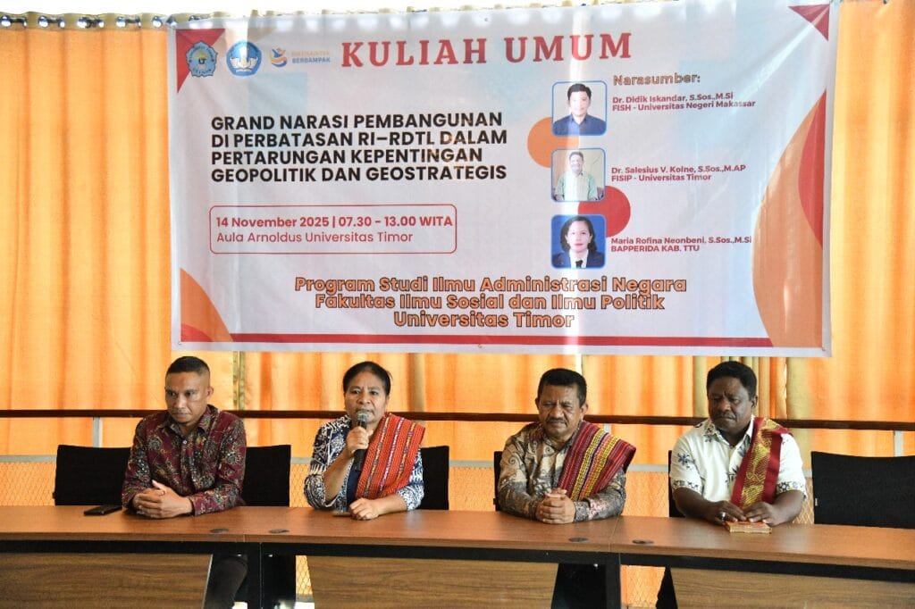 Unimor, Kefamenanu. Program Studi Ilmu Administrasi Negara, Fakultas Ilmu Sosial dan Ilmu Politik Universitas Timor menyelenggarakan kuliah umum secara hybrid dengan tema, “Grand Narasi Pembangunan di Perbatasan RI-RDTL dalam Pertarungan Kepentingan Geopolitik dan Geostrategis”. Kuliah umum ini dilaksanakan di Aula Lt. 3 Gedung Kuliah Fakultas Pertanian, Sains, dan Kesehatan, Jumat (14/11/2025). Kuliah umum ini dihadiri oleh Wakil Rektor Bidang Kemahasiswaan dan Alumni Unimor, Dekan FISIPOL, Ketua LPMPP, Wakil Dekan I FISIPOL, Ketua Prodi Ilmu Administrasi Negara, Ketua Prodi Ilmu Pemerintahan, dosen dan mahasiswa prodi Ilmu Administrasi Negara dan juga mahasiswa dari beberapa kampus swasta di Kota Kefamenanu.